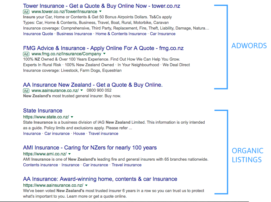 SEO stands for Search Engine Optimisation, which encompases any effort that goes into boosting a website in organic search engine listings. By organic listings, we mean any listings below the top three AdWords placements (as shown below).