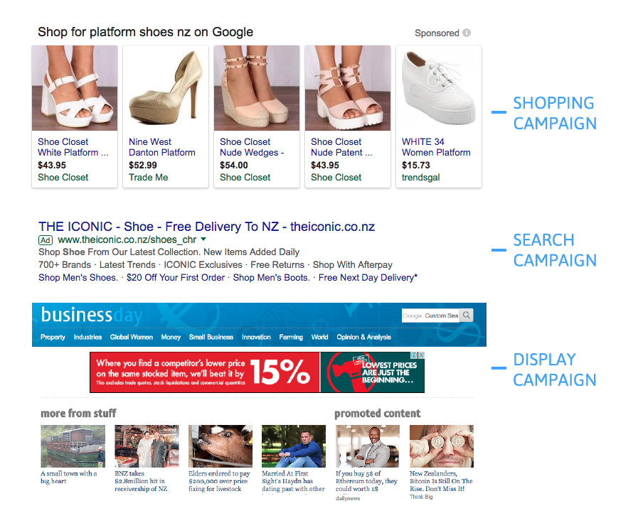 Google AdWords is an advertising platform that can get your website listed at the top of search queries with ads that look very similar to organic search results, as well as banner style ads, product listings and more. Here are a few examples: